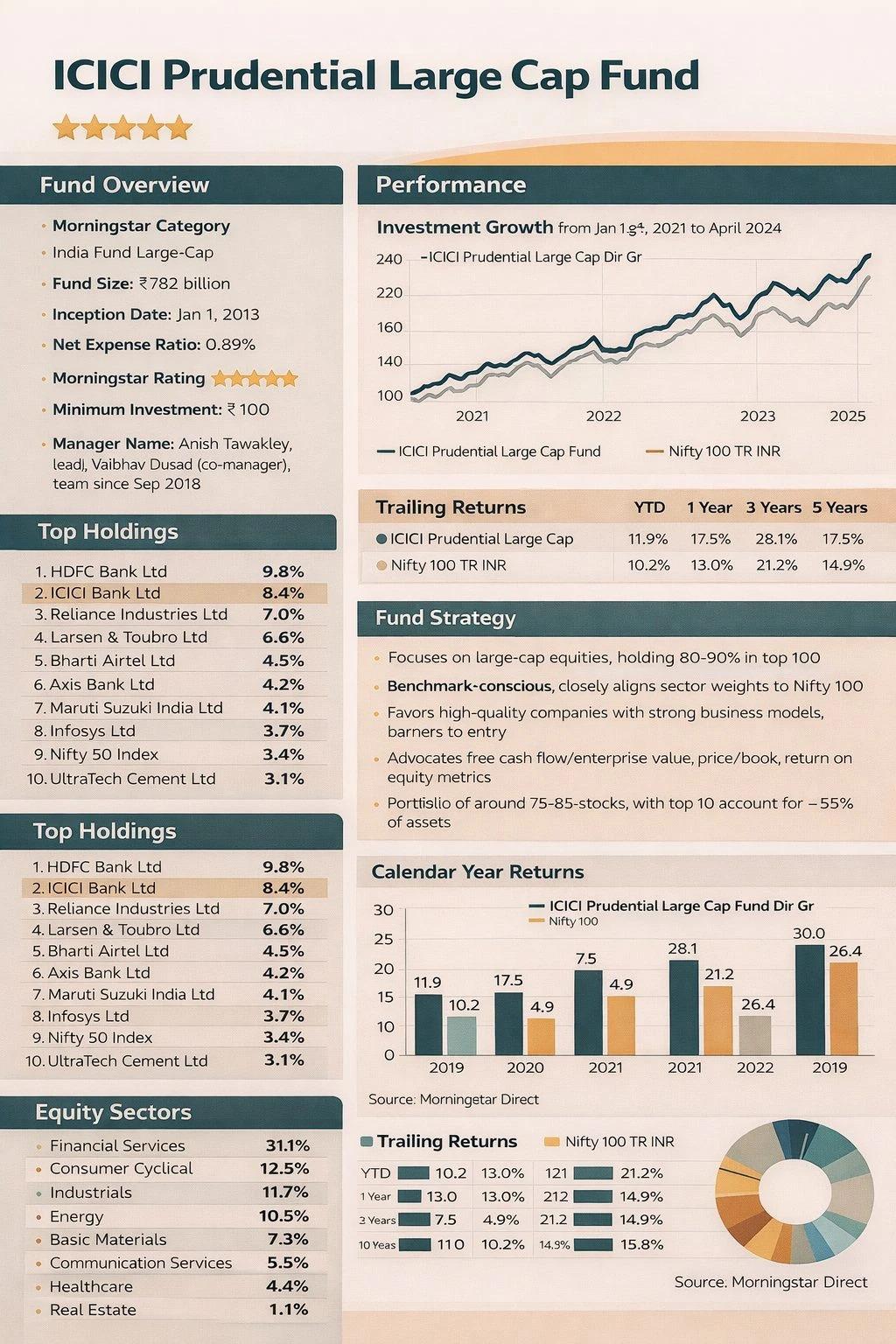पोर्टफोलियो में 80-90 फीसदी निवेश लार्ज-कैप शेयरों में रहता है, जो आमतौर पर 75-85 होल्डिंग्स में फैला होता है। टॉप 10 शेयर करीब 55 फीसदी हिस्सेदारी रखते हैं, जिनमें HDFC Bank, ICICI Bank, Reliance Industries, Larsen & Toubro और Bharti Airtel शामिल हैं। फाइनेंशियल सर्विसेज सबसे बड़ा सेक्टर है, जिससे पोर्टफोलियो संतुलित बना रहता है।
