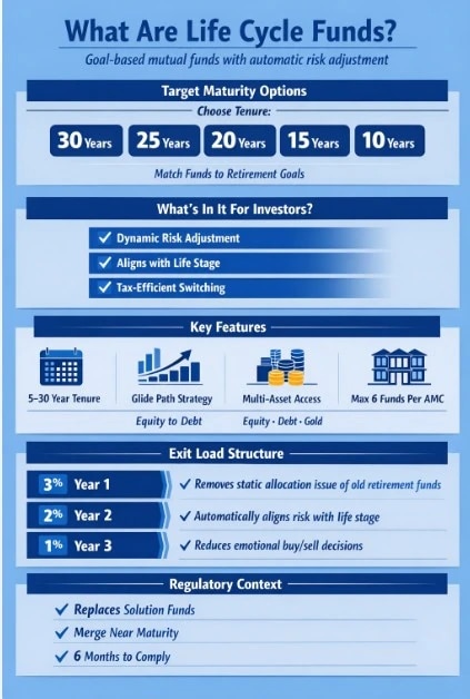 लॉन्ग टर्म के लिए SEBI ने ग्रेडेड एग्जिट लोड तय किया है- पहले साल में 3%, दूसरे साल में 2% और तीसरे साल में 1%। इससे समय से पहले निकासी कम होगी। ये फंड इक्विटी, डेट, InvITs, ETCDs और गोल्ड-सिल्वर ETFs में निवेश कर सकेंगे। हालांकि, कोई भी AMC एक समय में अधिकतम छह लाइफ साइकिल फंड ही लॉन्च कर सकेगी।