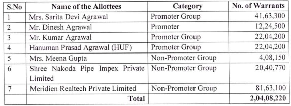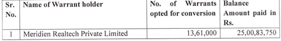 कंपनी ने अब बताया है कि ऊपर बताए गए सात वारंट होल्डर्स में से एक, M/s Meridien Realtech Private Limited (MRPL) ने अपने 13,61,000 वारंट्स को इक्विटी शेयर में बदलने का विकल्प इस्तेमाल किया है। इसके लिए उन्होंने वारंट की बाकी 75% राशि यानी 183.75 रुपये प्रति वारंट का भुगतान किया।
