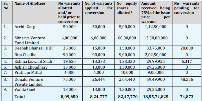 कंपनी ने यह भी बताया कि अभी कुल 61,23,862 वारंट्स कन्वर्जन के लिए लंबित हैं। इन वारंट धारकों को अलॉटमेंट की तारीख से 18 महीने के भीतर ₹225 प्रति वारंट का भुगतान कर अपने वारंट्स को इक्विटी शेयरों में बदलने का अधिकार है।