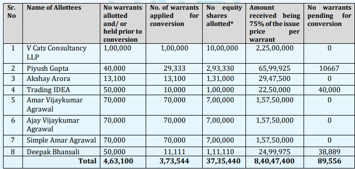 कंपनी ने यह भी बताया है कि अभी 72,28,306 वारंट्स कन्वर्जन के लिए लंबित हैं, जिन्हें वारंट होल्डर्स अलॉटमेंट की तारीख से 18 महीनों के भीतर बाकी 225 रुपये प्रति वारंट जमा कराकर इक्विटी शेयरों में बदल सकते हैं।