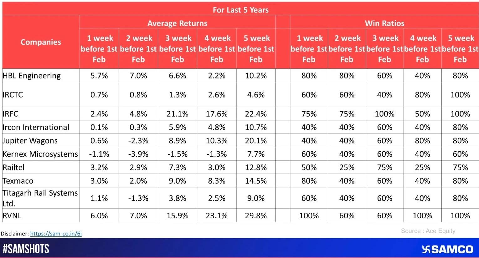 Samco Securities ने सोमवार को जारी अपने फ्रेश नोट में कहा कि रेलवे से जुड़े शेयरों में बजट से पहले की रैली बीते पांच साल से लगातार दिख रही है। खास बात यह है कि जैसे-जैसे बजट का दिन नजदीक आता है, रिटर्न और मजबूत होते जाते हैं।