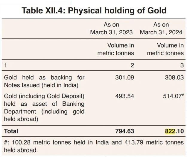 आरबीआई द्वारा जारी वार्षिक आंकड़ों के अनुसार, 31 मार्च 2024 तक केंद्र के पास अपने विदेशी मुद्रा भंडार के हिस्से के रूप में 822.10 टन सोना था, जो पिछले साल इसी अवधि के दौरान 794.63 टन से अधिक था।