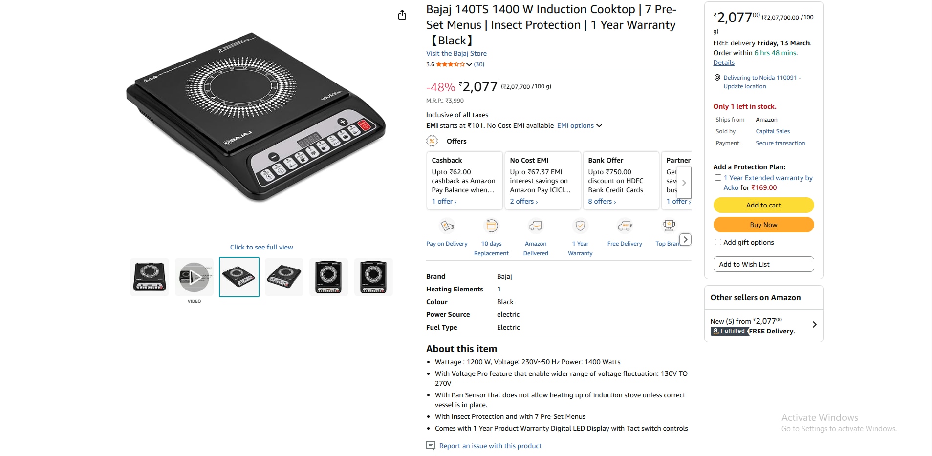 बजाज का यह इंडक्शन कुकटॉप 1400 वॉट पावर के साथ आता है। इसमें डिजिटल एलईडी डिस्प्ले और टच कंट्रोल दिए गए हैं। इसमें पैन सेंसर फीचर भी है, जो सही बर्तन न होने पर चूल्हे को गर्म नहीं होने देता। इसके अलावा इसमें 7 प्री-सेट मेन्यू और वोल्टेज प्रो फीचर दिया गया है, जो 130V से 270V तक के वोल्टेज फ्लक्चुएशन में भी काम करता है। अमेजन पर इसकी कीमत करीब 2079 रुपये है और इस पर 1 साल की वारंटी मिलती है।