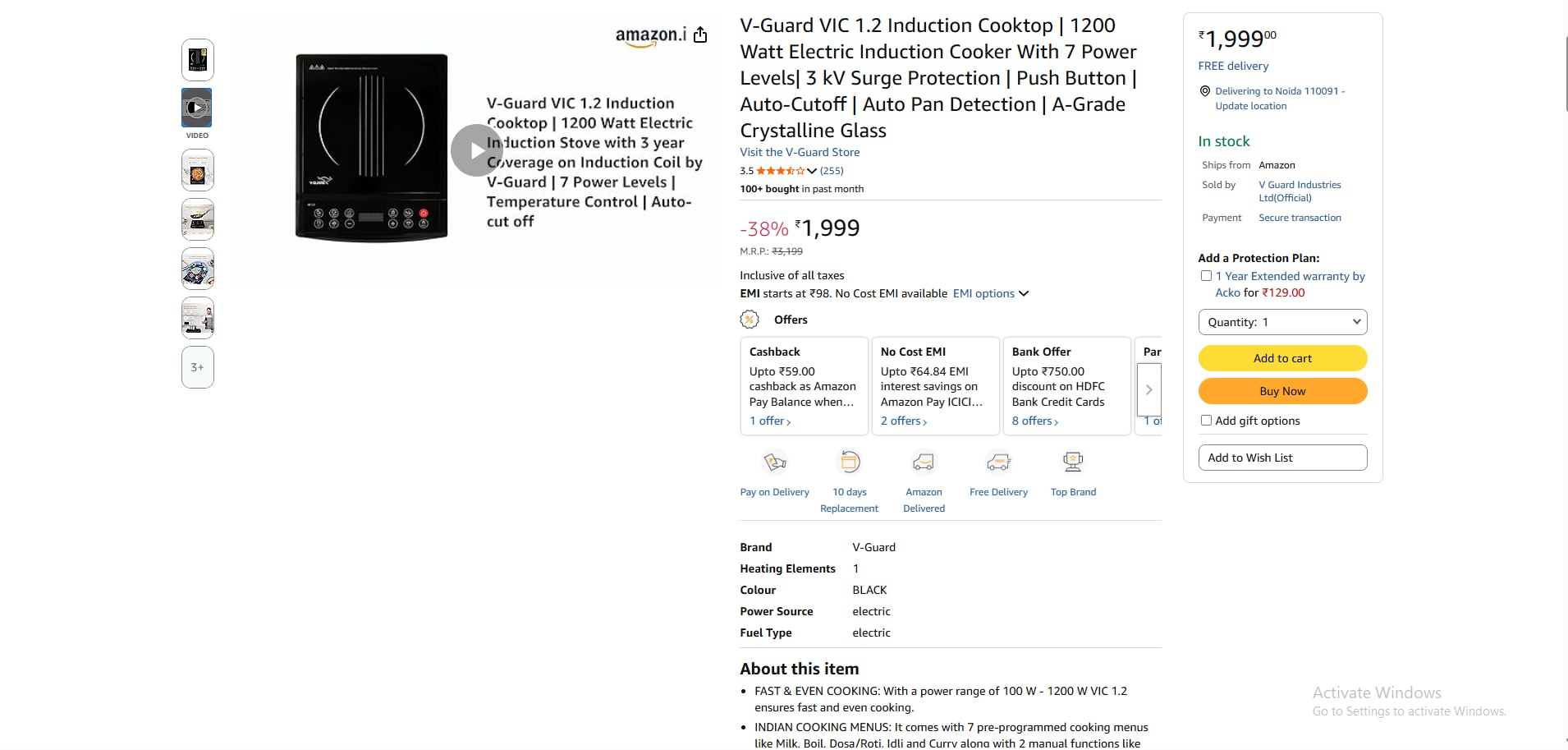 वी-गार्ड का यह इंडक्शन कुकटॉप 100 से 1200 वॉट तक की पावर रेंज के साथ आता है, जिससे खाना जल्दी और समान रूप से पकता है। इसमें दूध, उबाल, डोसा/रोटी, इडली और करी जैसे 7 प्री-प्रोग्राम्ड मेन्यू दिए गए हैं। इसके अलावा इसमें 4 घंटे का टाइमर, 24 घंटे का प्रीसेट फंक्शन और ऑटो पैन डिटेक्शन जैसे फीचर्स भी मिलते हैं। अमेजन पर इसकी कीमत करीब 1999 रुपये है।