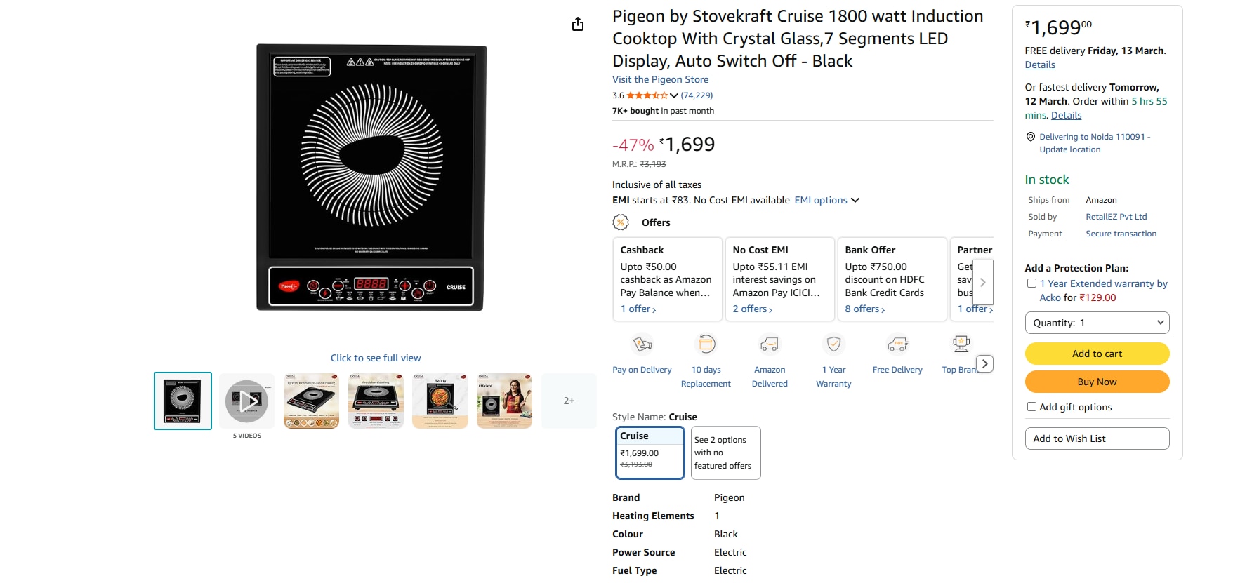 पिजन कंपनी का यह इंडक्शन कुकटॉप 1800 वॉट पावर के साथ आता है। इसमें 7 सेगमेंट एलईडी डिस्प्ले और स्मार्ट टाइमर जैसे फीचर्स दिए गए हैं। इसमें हाई ग्रेड इलेक्ट्रिकल सिस्टम लगा है जो शॉर्ट सर्किट से सुरक्षा देता है। यह इंडक्शन तभी काम करता है जब उस पर इंडक्शन बेस वाला बर्तन रखा जाता है। अमेजन पर इसकी कीमत करीब 1699 रुपये है और इस पर 1 साल की वारंटी मिलती है।