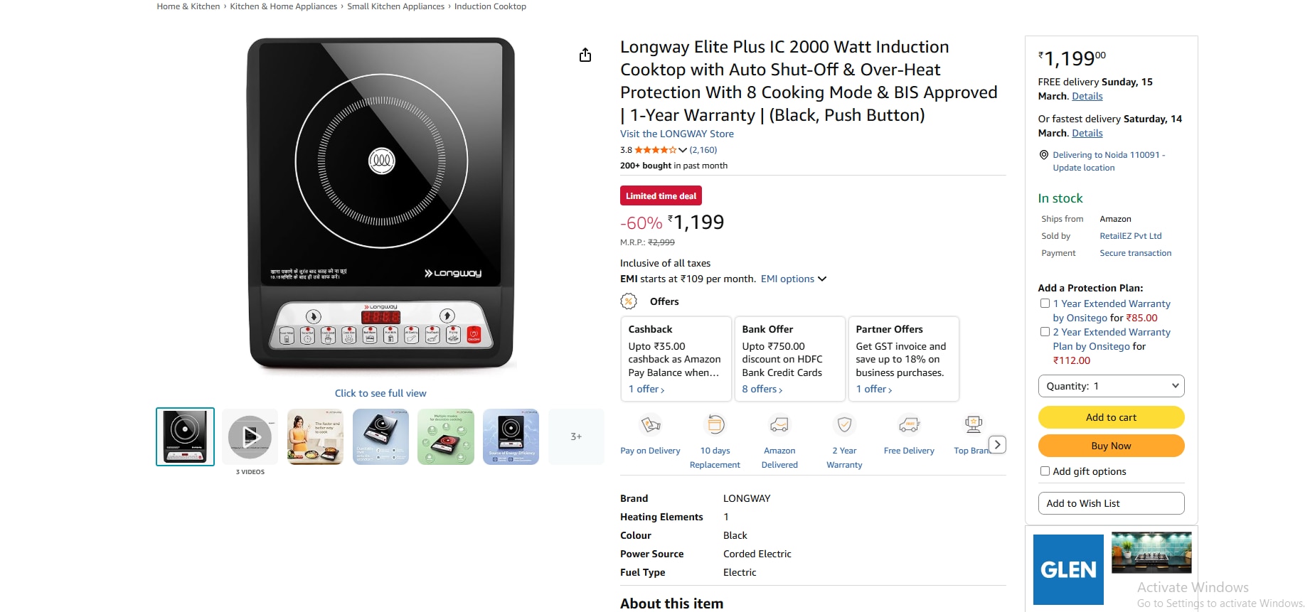 लॉन्गवे का यह इंडक्शन कुकटॉप 2000 वॉट पावर के साथ आता है। इसमें 7 प्रीसेट फंक्शन दिए गए हैं, जिससे अलग-अलग तरह के खाने बनाना आसान हो जाता है। इसका बॉडी एबीएस प्लास्टिक से बना है और इसमें शॉक-प्रूफ और रस्ट-प्रूफ टेक्नोलॉजी दी गई है। अमेजन पर इसकी कीमत करीब 1199 रुपये है। कंपनी इस पर 2 साल की वारंटी भी देती है।