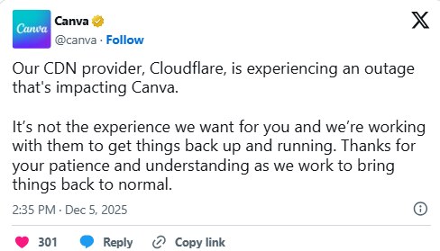 Canva ने X पर कहा 'CDN provider, Cloudflare, is experiencing an outage that's impacting Canva…' हम Cloudflare के साथ मिलकर इसे ठीक करने पर काम कर रहे हैं।