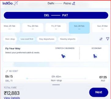 28 फरवरी को इस दूरी के लिए बुक की गई इंडिगो फ्लाइट्स का किराया लगभग 12,500 रुपये से अधिक है।