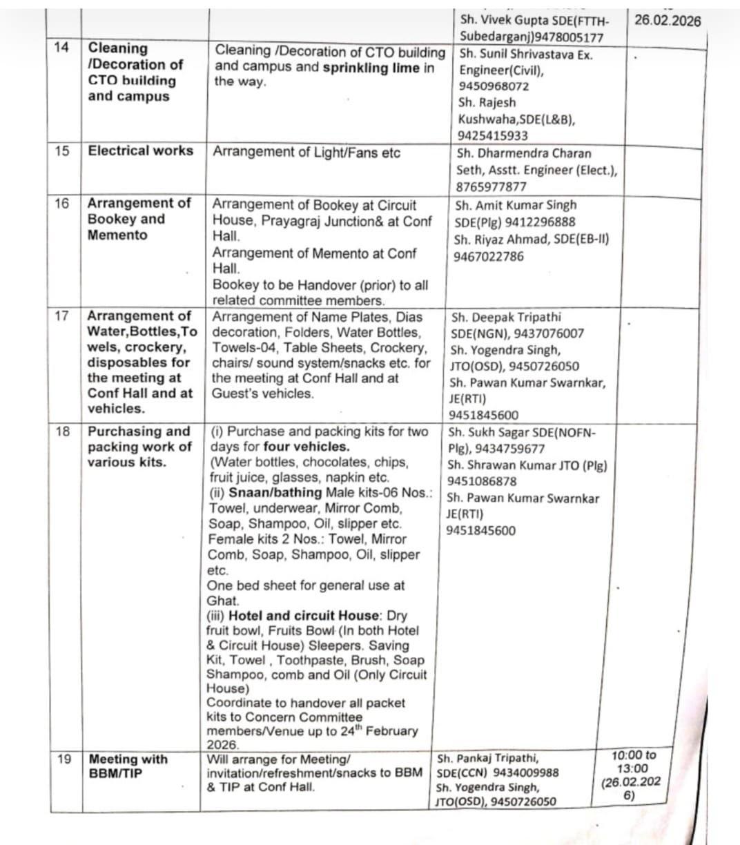 भारतीय संचार निगम लिमिटेड के डायरेक्टर विवेक बंजल के प्रस्तावित प्रयागराज दौरे को लेकर बना यह बेहद खास और वीआईपी प्रोटोकॉल सोशल मीडिया पे वायरल हो गया है जिससे उनके लिए मुसीबतें बढ़ गयी हैं। विवाद बढ़ने से उनका दौरा कैंसिल भी हो गया है।